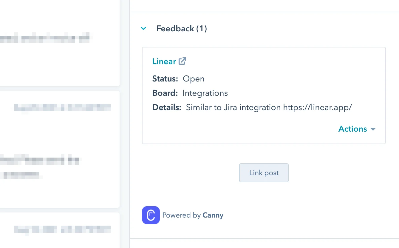 Send feedback to your product team without disrupting your current workflow. Search and create Canny posts from HubSpot.