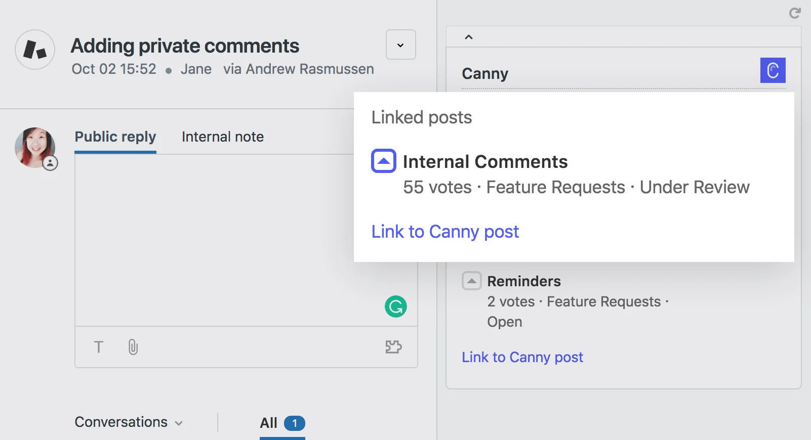 Keep track of feedback without disrupting your current workflow. Search and create Canny posts from Zendesk.